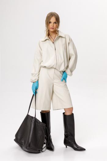 Жакет выполнен из костюмной ткани в клетку. Жакет прямого силуэта, покроя оверсайз, длиной до линии бедер. Спереди двубортная застежка на две металлические пуговицы, лацканы, прорезные карманы с наклонным входом и клапаном. Спинка со средним швом. Воротником пиджачного типа. Рукав втачного покроя, двухшовный. Жакет на притачной по низу подкладке.