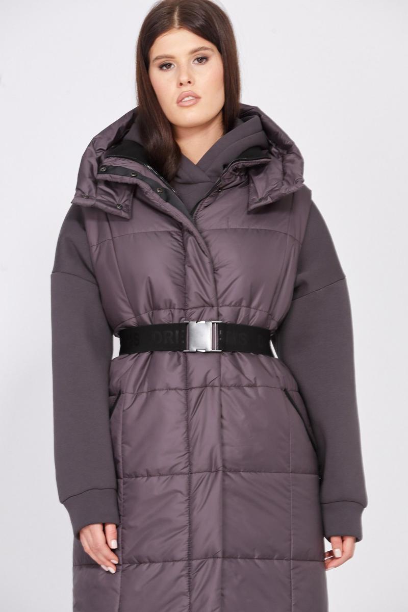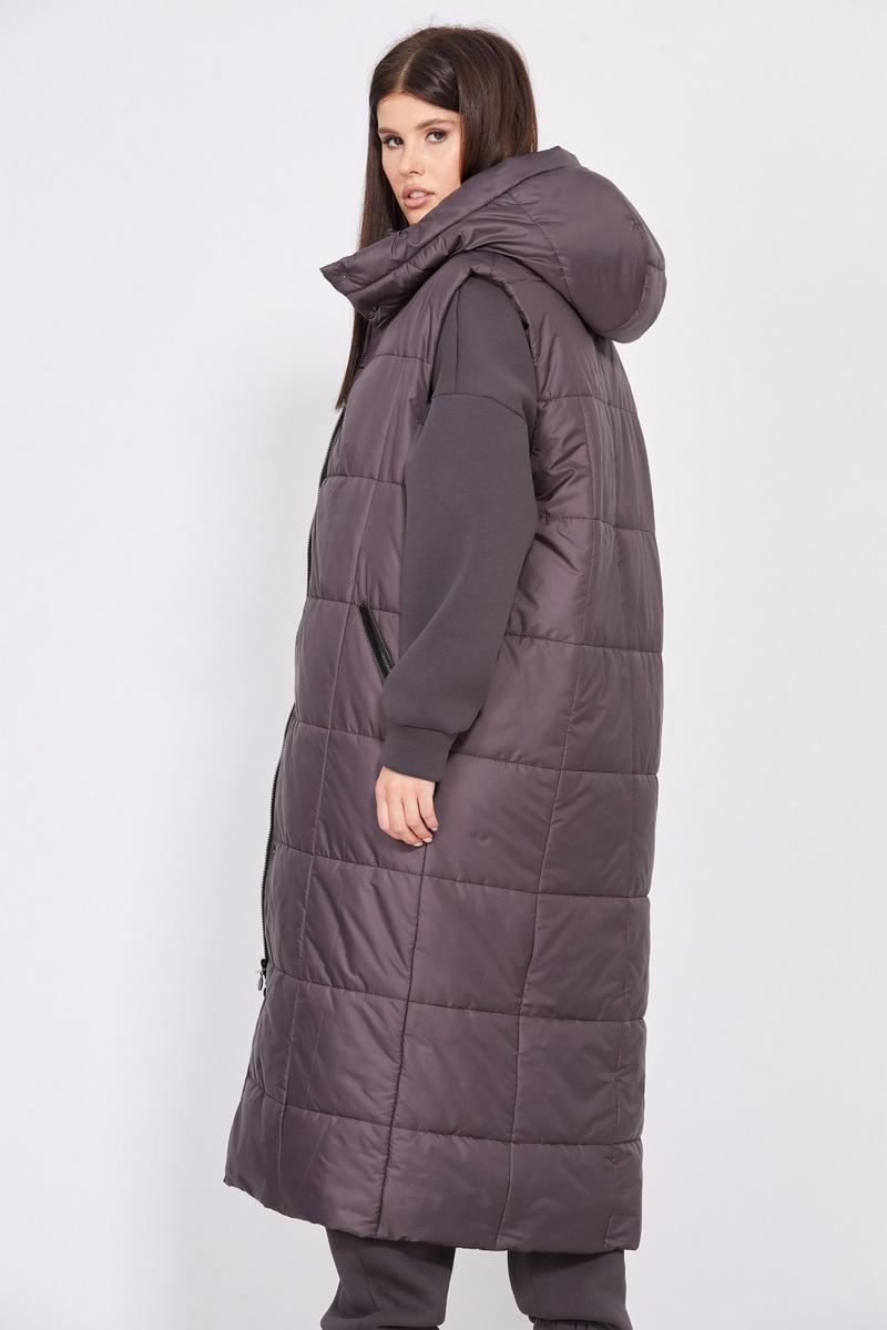 Жилет выполнен из матовой плащевой ткани, простеганной с изософтом. Жилет прямого силуэта, длиной миди. Спереди застежка на молнию и кнопки на планке. Карманы прорезные, застегивающиеся на молнию. Спинка со средним швом. Воротник-стойка. Капюшон съемный, крепится на пуговицы. В комплект входит съемный ремень из широкой эластичной тесьмы с пряжкой-карабином. Жилет на притачной по низу подкладке.