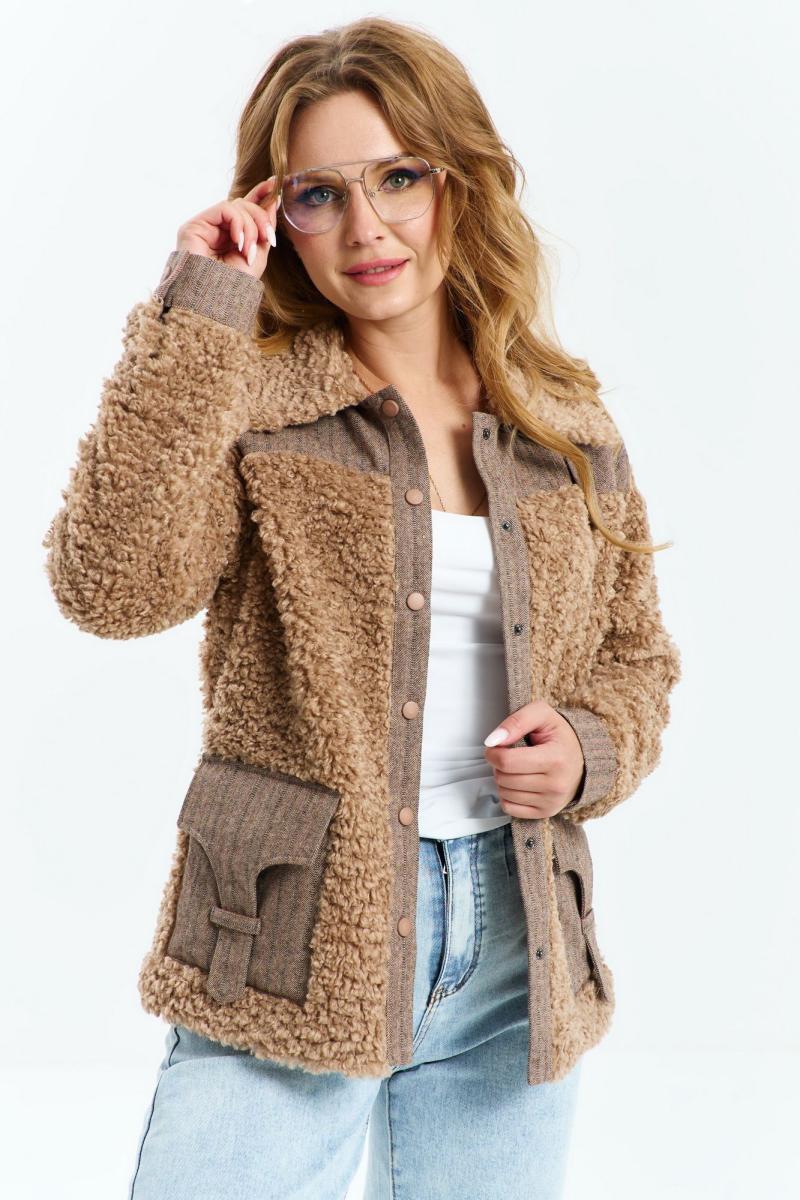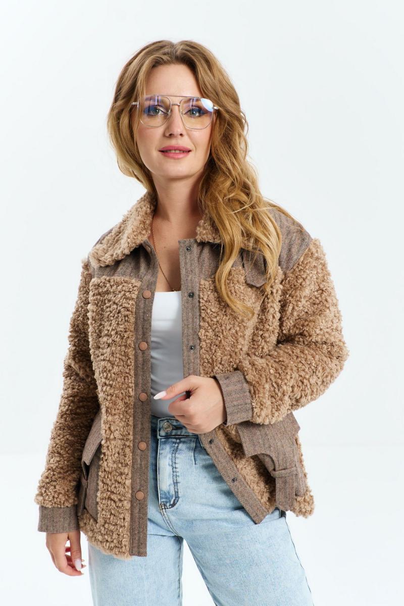 Жакет женский выполнен в сочетании костюмной хлопковой ткани и искусственного меха, изделие свободного кроя . На полочке и спинке изделия расположена контрастная кокетка, рукав втачной длинный с манжетой по низу, горловина- отложной воротник на стойке. Застежка петли-кнопки на планке. без утеплителя