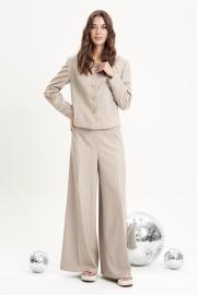 Жакет из необычного по текстуре материала с вкраплением пайетки, брюки из полотна без пайетки. Полуприлегающий силуэт пиджака с центральной застёжкой, круглым вырезом горловины и втачным покроем. Полочка с фигурным рельефом, спинка с фигурным рельефом, центральным швом и плечевыми вытачками. Рукав двухшовный.