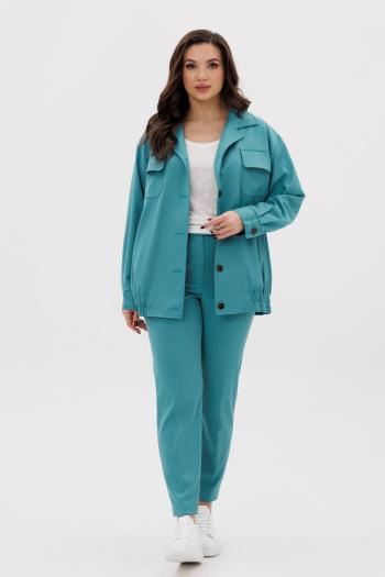 Жакет с центральной двубортной застежкой на петли и пуговицы, втачным воротником и отложными лацканами пиджачного типа. На полочках расположены прорезные карманы с клапаном и двумя обтачками. Полочки с рельефами, выходящими из проймы, талиевой вытачкой. Спинка со средним швом, рельефами, выходящими из проймы. Рукав втачной, длинный, двухшовный.