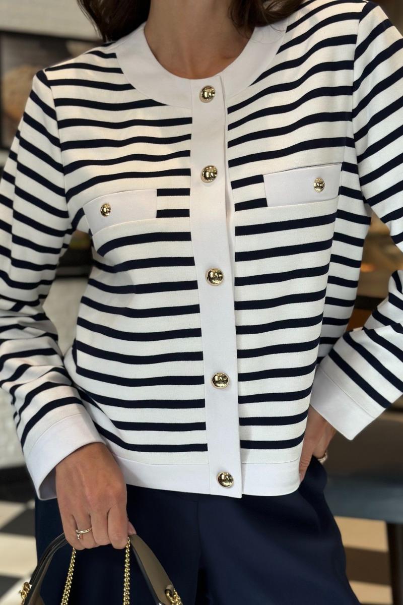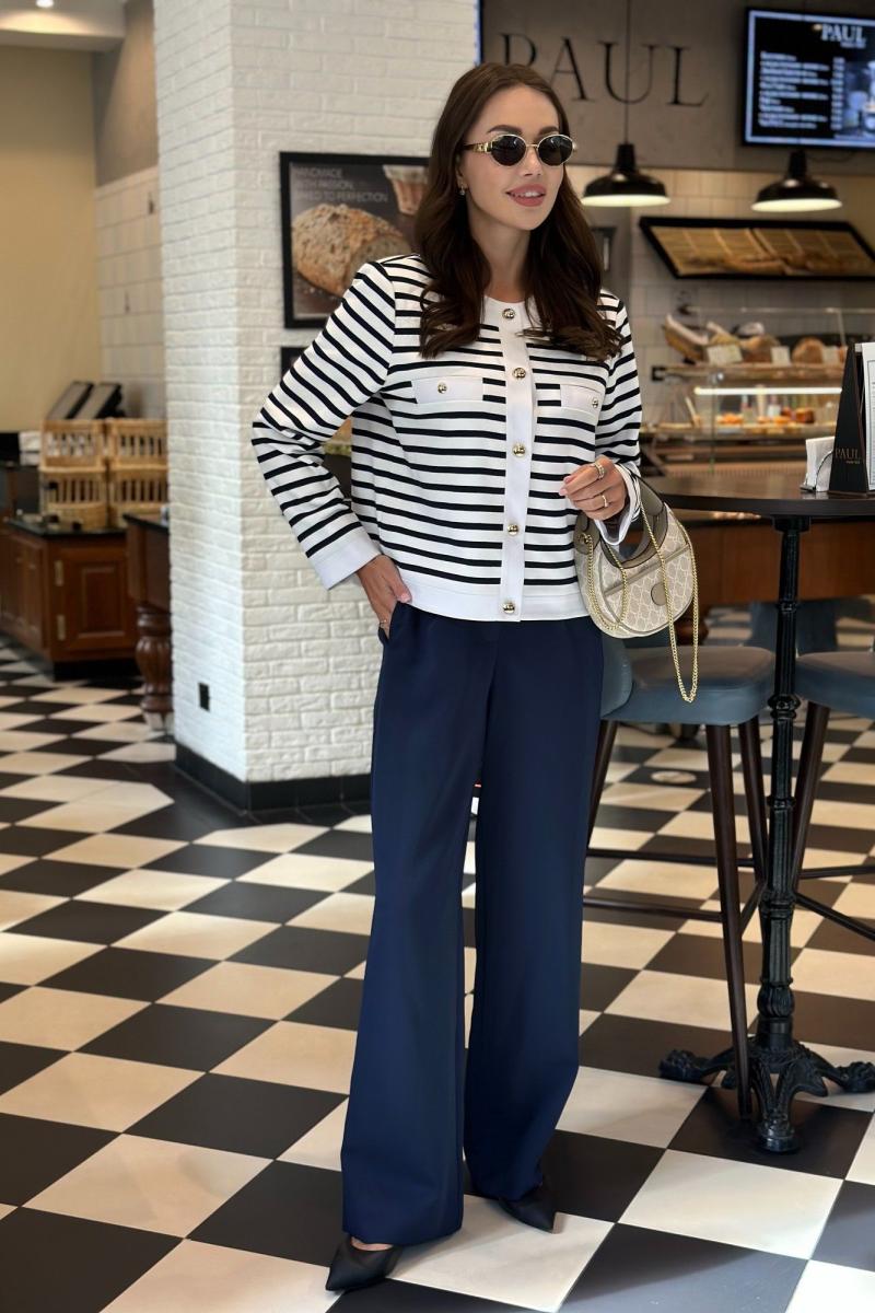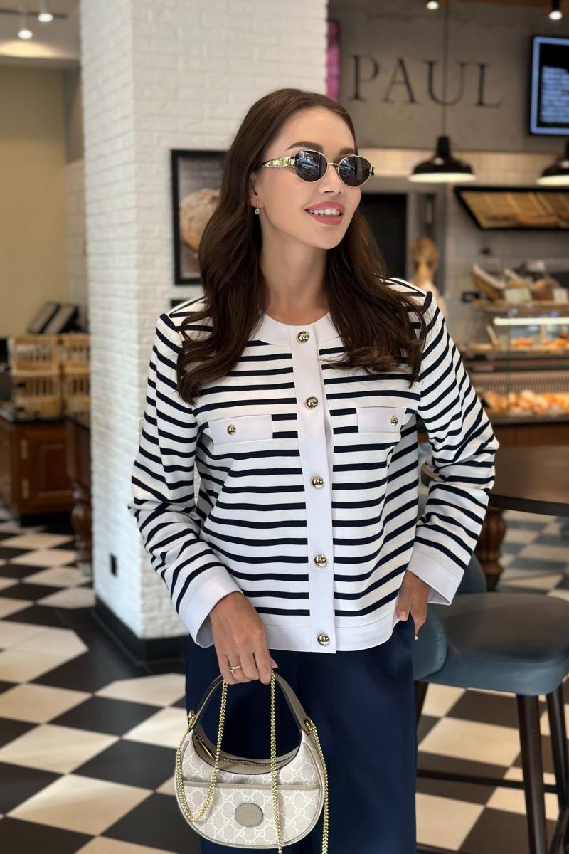 Жакет женский прямого силуэта, на подкладке, застегивающийся на кнопки. По переду в области груди расположены прорезные нефункциональные карманы с листочкой из ткани-компаньона. Спинка цельнокроеная. Плечо спущено. Рукав длинный, одношовный. Горловина округлой формы. Обтачка горловины, низ жакета, манжета рукава и планки переда выполнены из ткани-компаньона.Цвет материала может отличаться по тону в зависимости от настроек вашего монитора! Длина жакета по спинке 55 см, длина рукава 61 см.