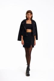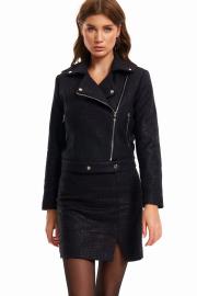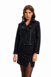 Жакет-«косуха» женская со смещенной застежкой на молнию, на подкладке. Перед с вертикальными рельефами и косыми прорезными карманами «в рамку» на молнии. Спинка с вертикальными рельефами. Рукав втачной двухшовный до линии запястья. Воротник стояче-отложной на отрезной стойке. Куртка длиной до середины бедра. По низу притачной пояс, который застегивается на 2 кнопки. В углах воротника расположены декоративные кнопки. Длина изделия - 52 см Длина рукава - 61 см