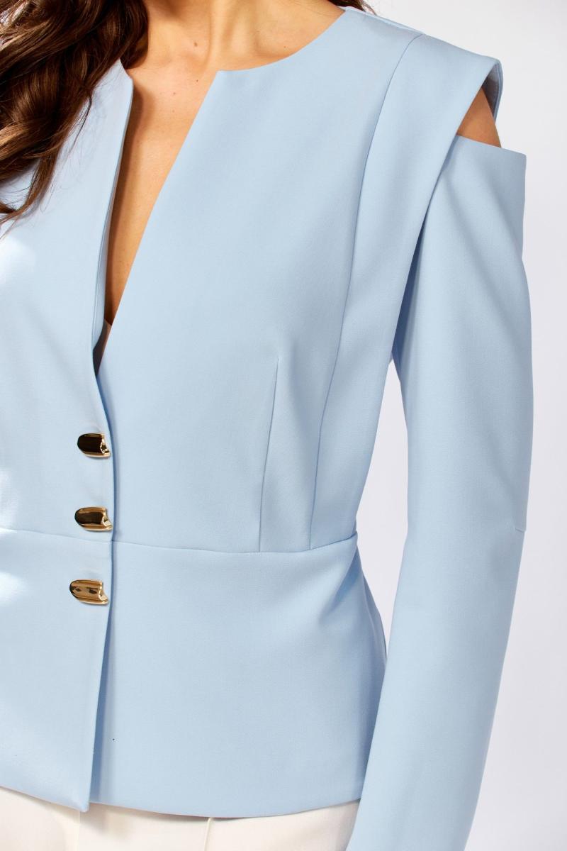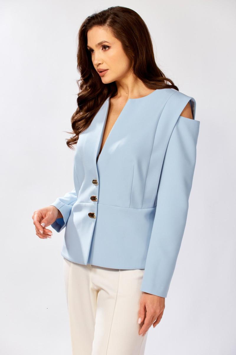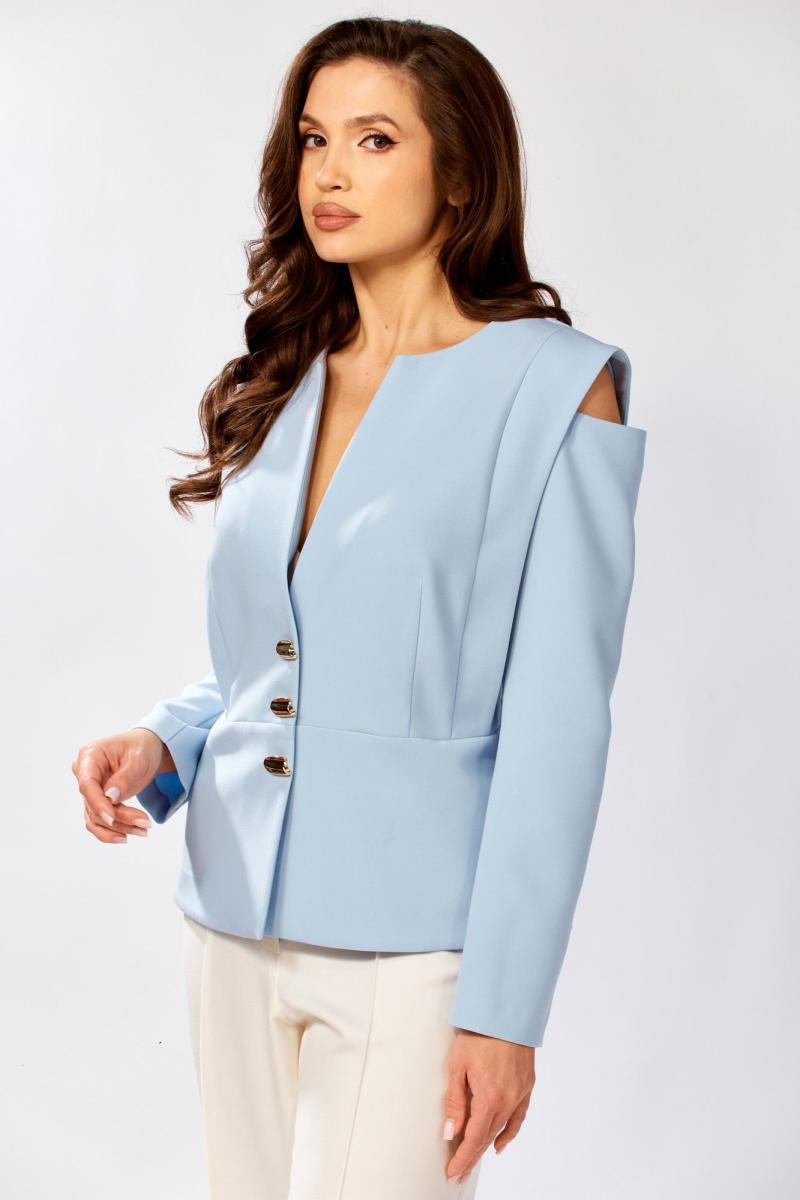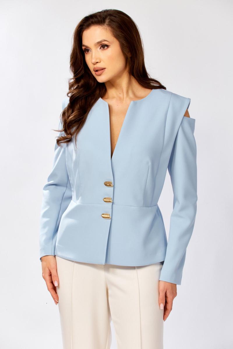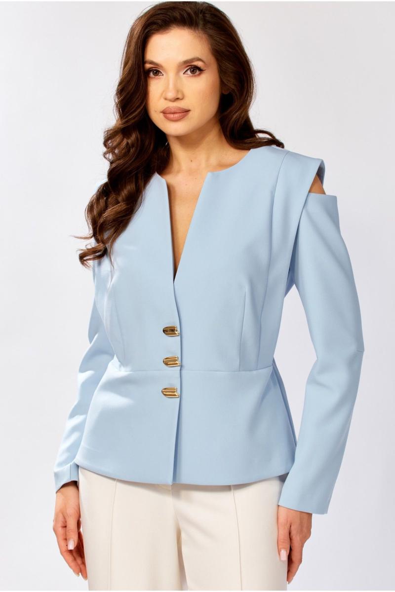 Жакет полуприлегающего силуэта. По полочке и спинке расположена отлетная кокетка, по низу изделия баска. Рукава длинные с открытым плечом. Структурированные плечи. Застежка на петли пуговицы. Жакет без подкладки. Низ изделия подшит на плоскошовной машине. Длина рукава56см; Длина жакета по среднему шву 61см.
