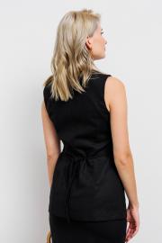 Элегантная приталенная жилетка. По переду застежка на три декоративные золотые пуговицы с "абстрактным рельефом". Так же имеются карманы. По спинке пояс-шнурок для акцента на линии талии.