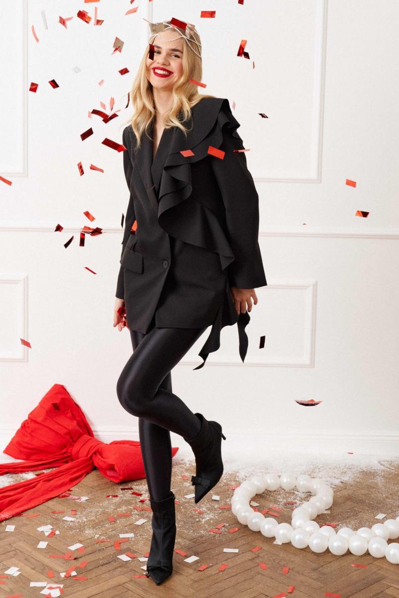 Жакет свободного кроя выполнена из костюмной ткани на подкладке. Рукав втачной. Воротник пиджачного кроя, застёжка центральная на петли и пуговицы. По переду левой половины жакета и на спинке фигурные рельефы, в которые вшиты по два волана, по бокам функциональные карманы с клапанами. По спинке средний шов. Длина по спинке от высшей точки горловины: 66 см; Длина рукава от горловины: 72 см ОГ: 126-130-134 см (размер 42-44-46-48).
