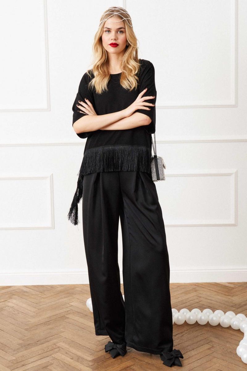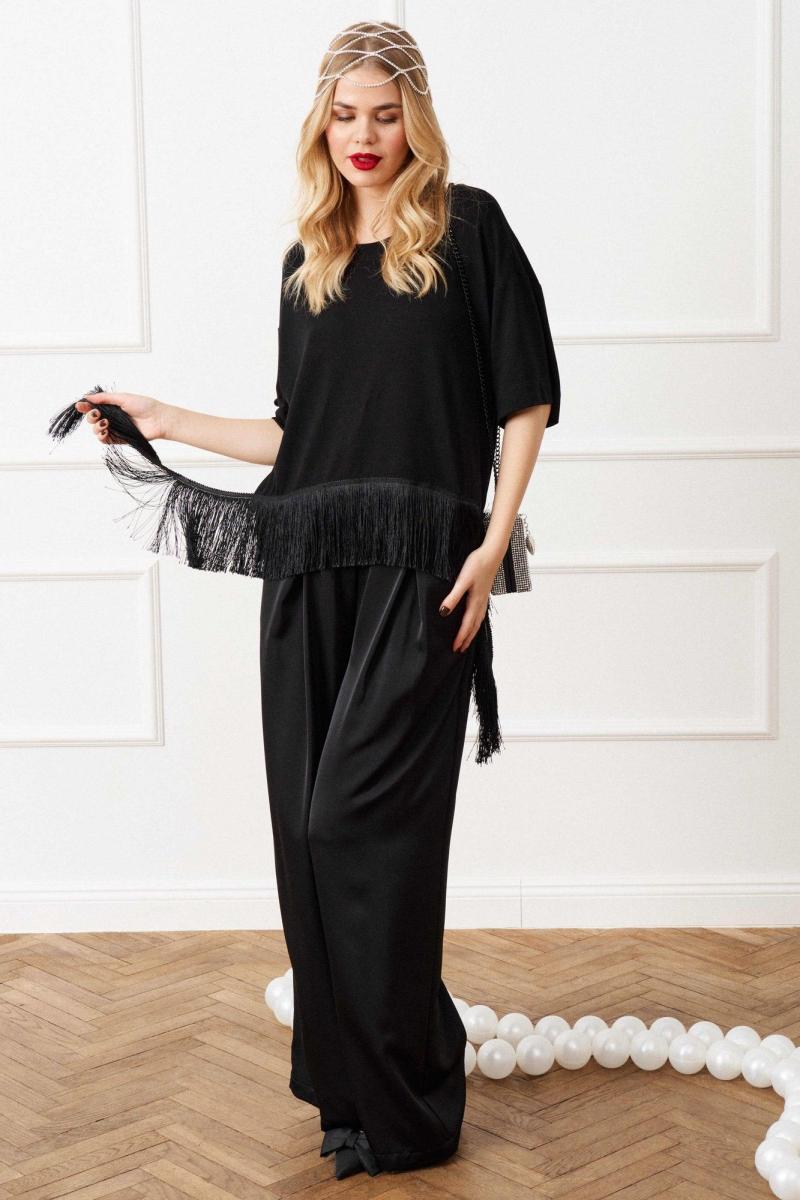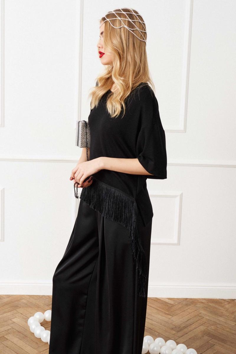 Блуза свободного кроя выполнена из трикотажного полотна, линия плеча спущена, рукав кроткий, округлый вырез горловины обработан бейкой, по переду к низу пришита бахрома с отлетными концами. Длина по спинке от высшей точки горловины: 62 см; Длина рукава от горловины: 38 см ОГ: 111-115-119-123-127 см (размер 42-44-46-48-50).