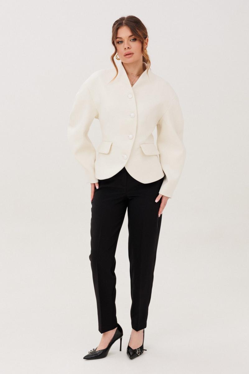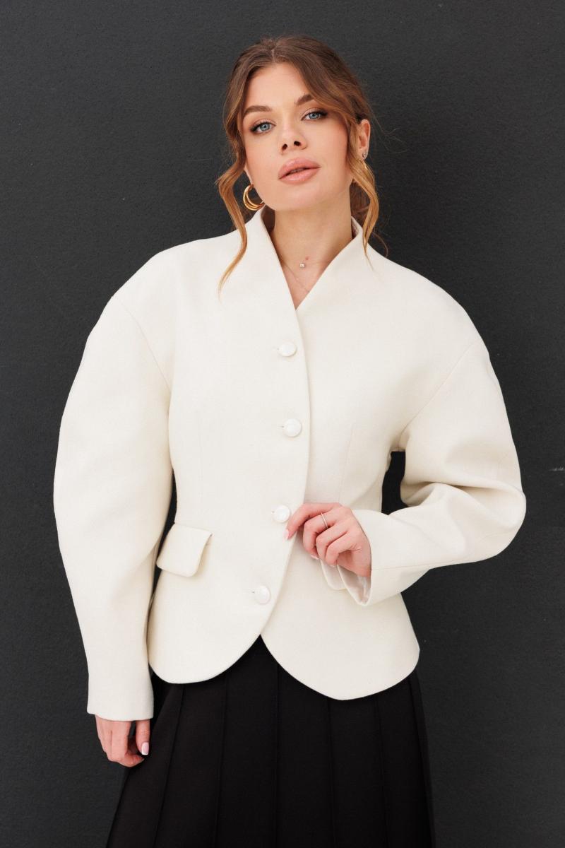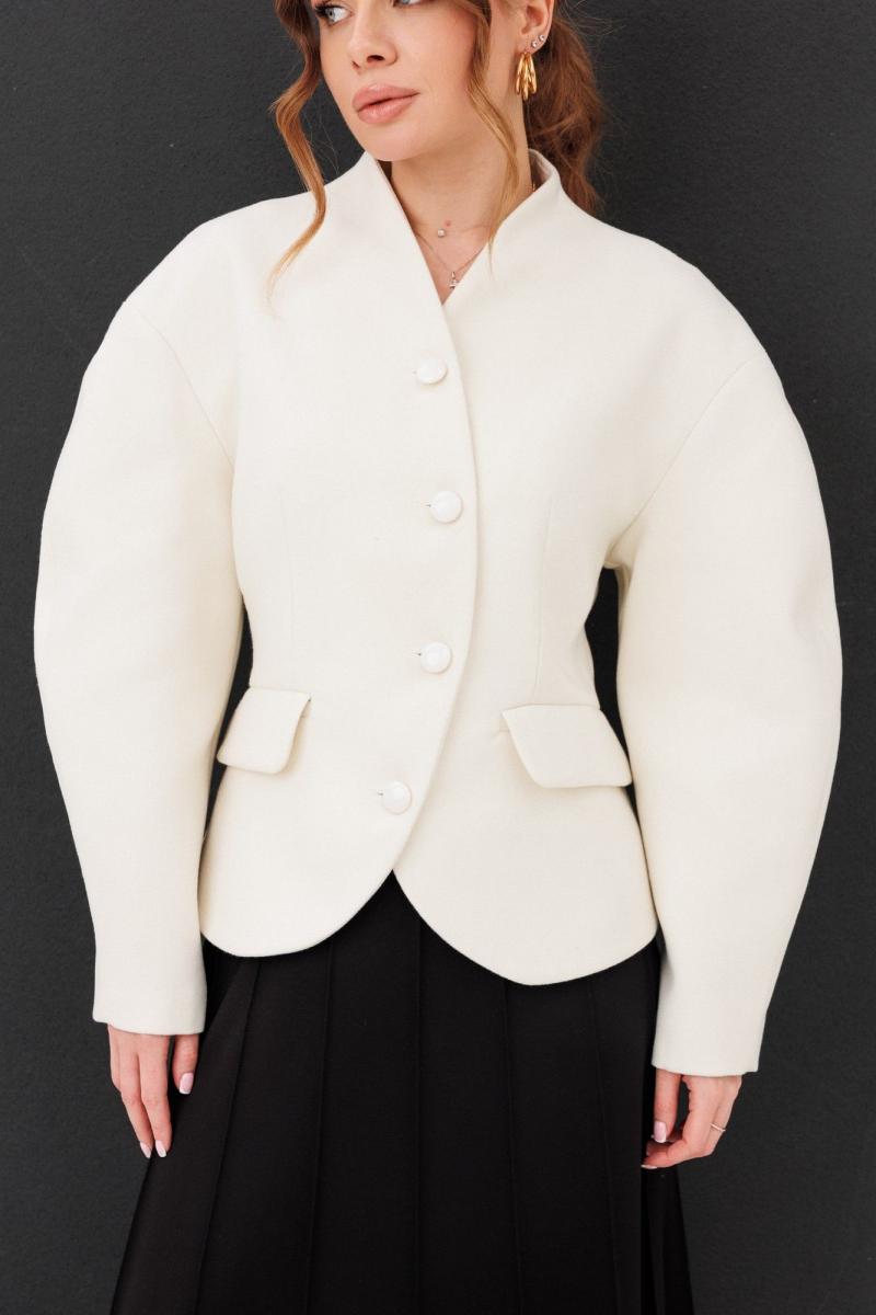 Жакет умеренного объема, приталенного силуэта, на притачной подкладке. Прилегание по спинке достигается рельефами и средним швом. Край борта округлой формы. Линия плеча расширена. Рукава втачные, длинные, двухшовные, фигурной формы, очень объемные у плеча и сужающиеся к запястью. Воротник цельнокроеная стойка. Застежка на петли пуговицы. Длина выше линии бедер. Длина рукава с шириной плеча, см 79,5-86,2, Длина изделия по спинке с высотой стойки 62,2-66 см 42 ОГ=84,ОТ=64,0Г=90, обхват плеча 26.50 см 44 ОГ=88,ОТ=68,ОБ=94,обхват плеча =27.90см 46 ОГ=92,ОТ=72, ОБ=98, обхват плеча =29.30 см 48 ОГ=96,ОТ=76, ОБ=102 ,обхват плеча 30.70 см 50 ОГ=100, ОТ80, ОБ 106 ,обхват плеча 32.10 см 52ОГ=104, ОТ=84 ОБ=110, обхват плеча 33.50 см