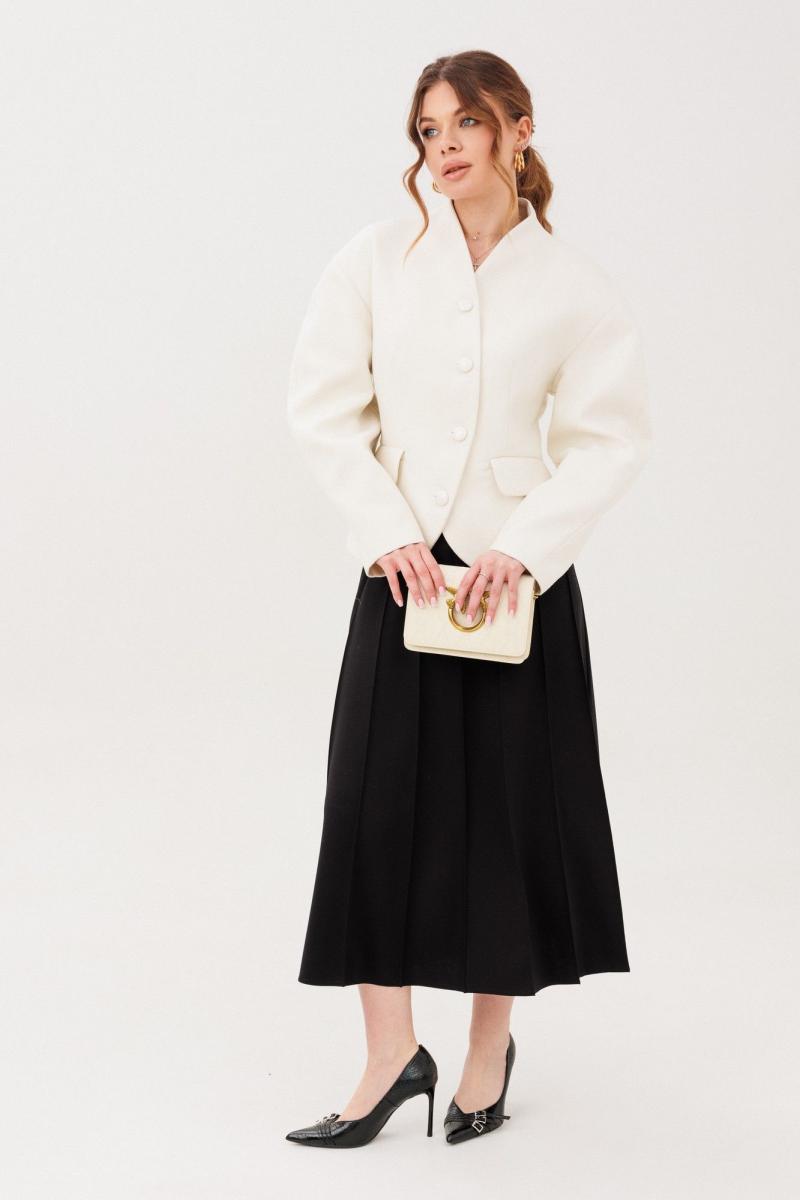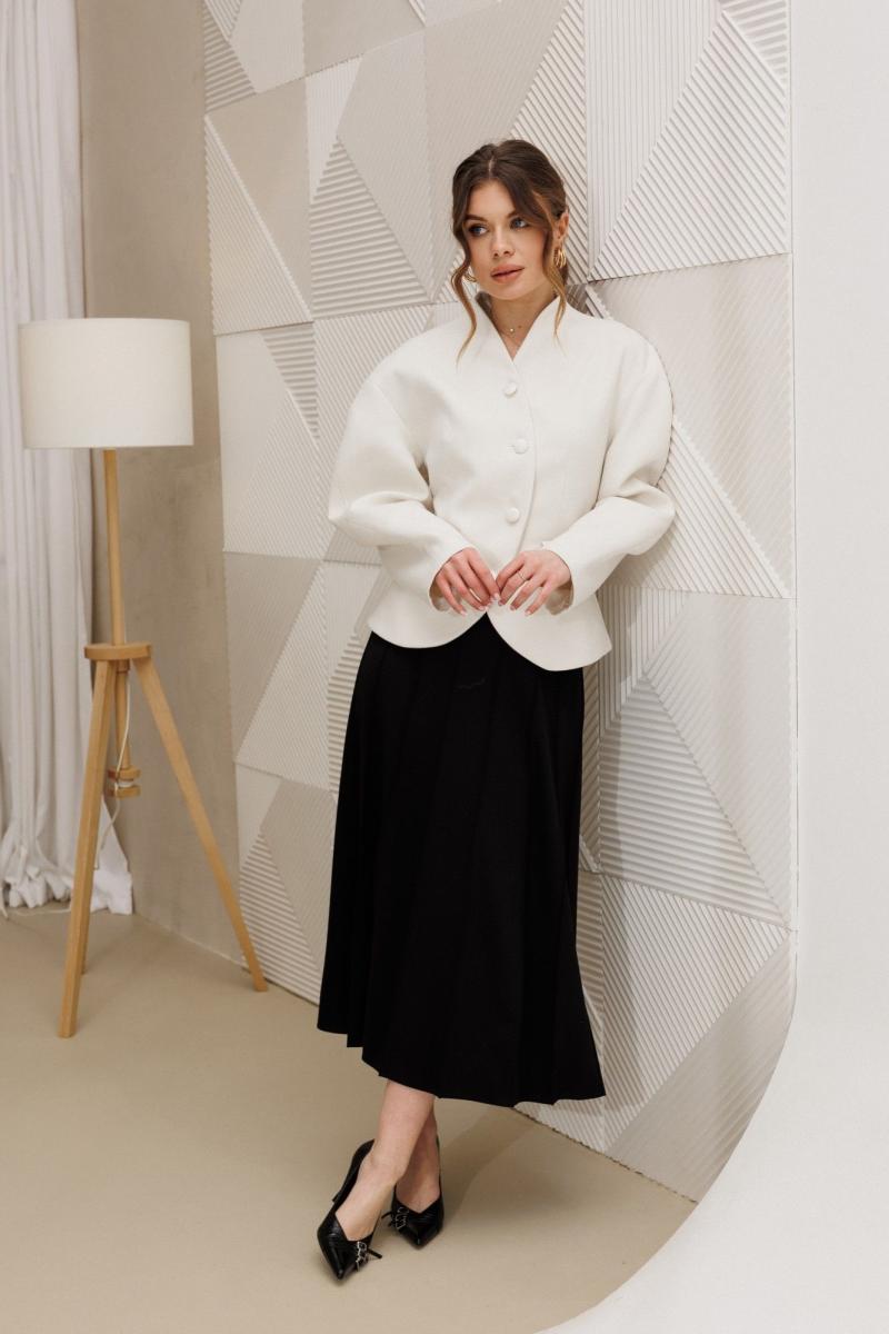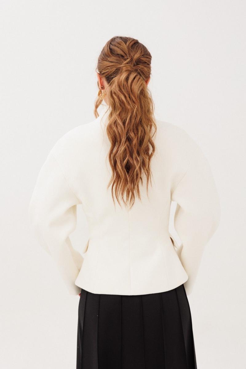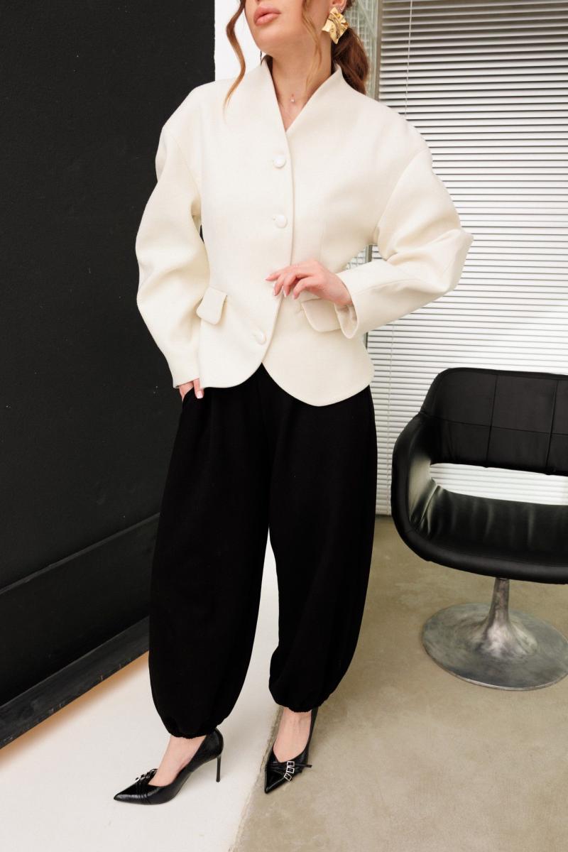 Жакет умеренного объема, приталенного силуэта, на притачной подкладке. Прилегание по спинке достигается рельефами и средним швом. Край борта округлой формы. Линия плеча расширена. Рукава втачные, длинные, двухшовные, фигурной формы, очень объемные у плеча и сужающиеся к запястью. Воротник цельнокроеная стойка. Застежка на петли пуговицы. Длина выше линии бедер. Длина рукава с шириной плеча, см 79,5-86,2, Длина изделия по спинке с высотой стойки 62,2-66 см 42 ОГ=84,ОТ=64,0Г=90, обхват плеча 26.50 см 44 ОГ=88,ОТ=68,ОБ=94,обхват плеча =27.90см 46 ОГ=92,ОТ=72, ОБ=98, обхват плеча =29.30 см 48 ОГ=96,ОТ=76, ОБ=102 ,обхват плеча 30.70 см 50 ОГ=100, ОТ80, ОБ 106 ,обхват плеча 32.10 см 52ОГ=104, ОТ=84 ОБ=110, обхват плеча 33.50 см