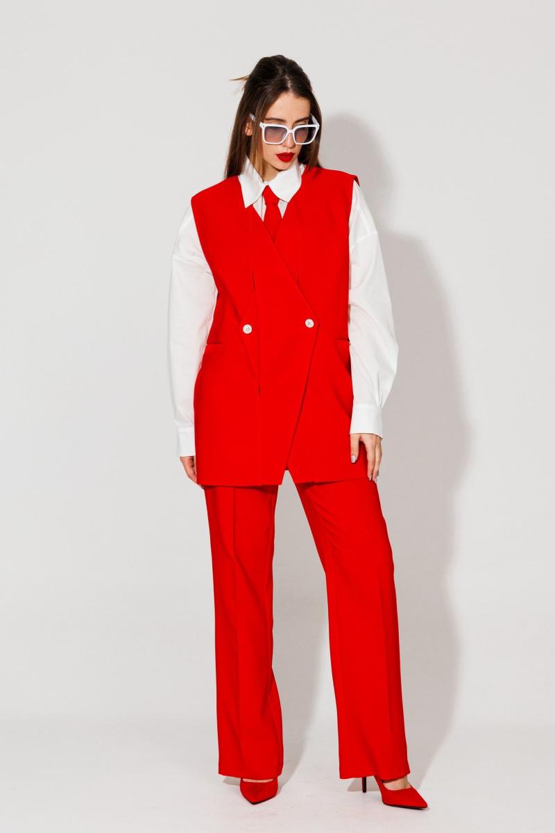 Жилет двубортный прямого кроя объёма оверсайз. Застёжка фигурная на петли и пуговицы. Карманы - листочки.