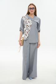 Жакет рубашечного типа прямого силуэта с асимметричным низом. Рукав втачной со спущенной линией плеча, фиксируется на пату. Застежка центральная на петли и пуговицы, смещённая по косой. Воротник отложной на стойке до половины спинки.