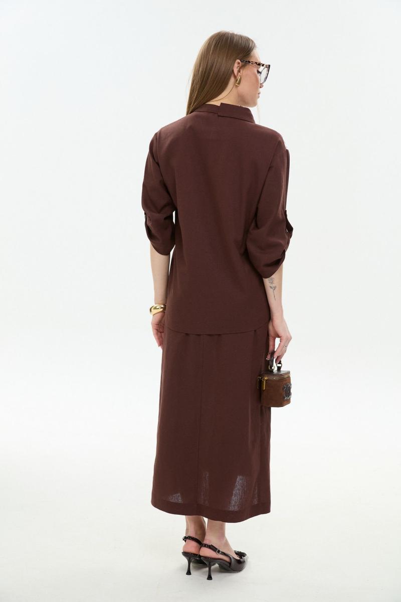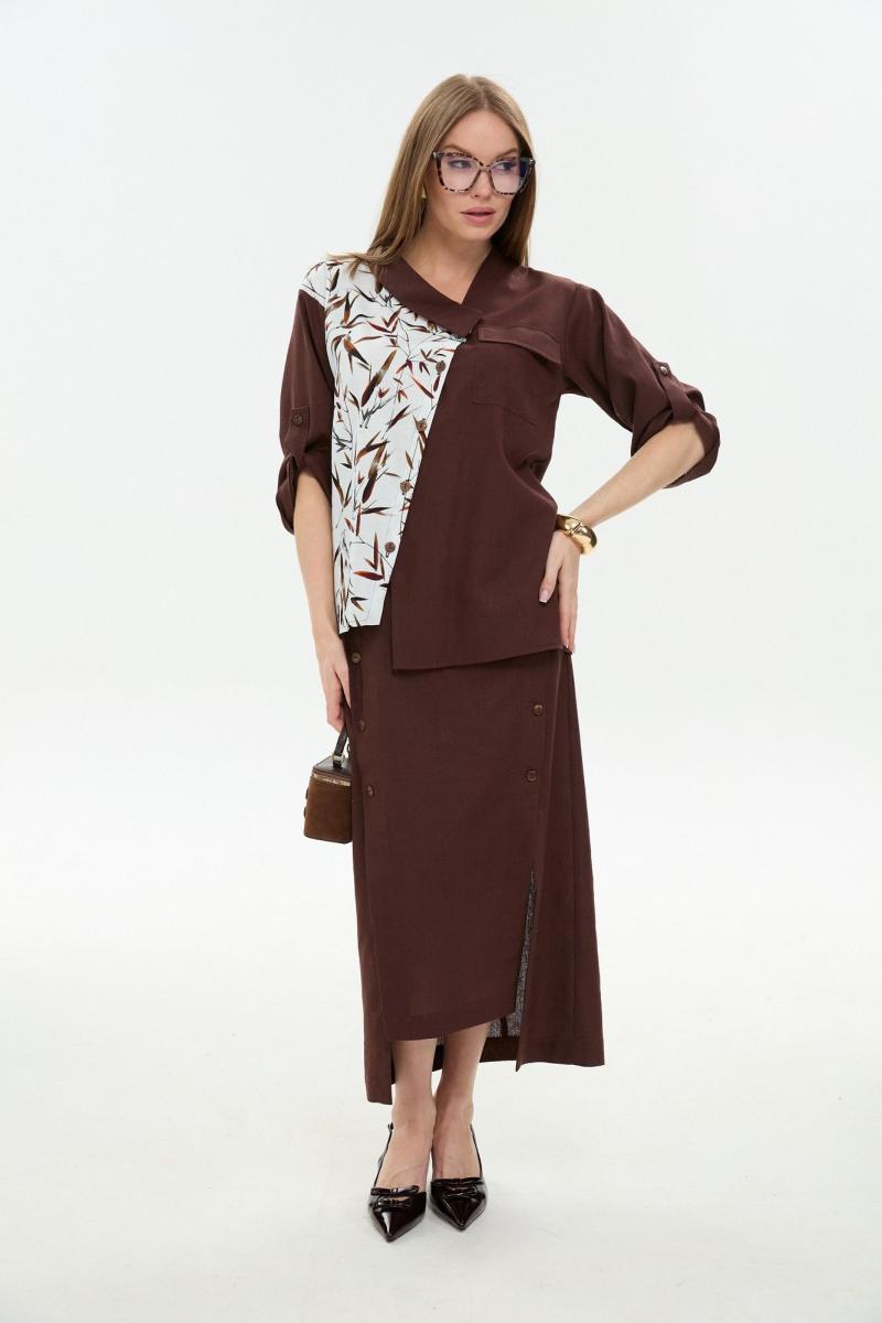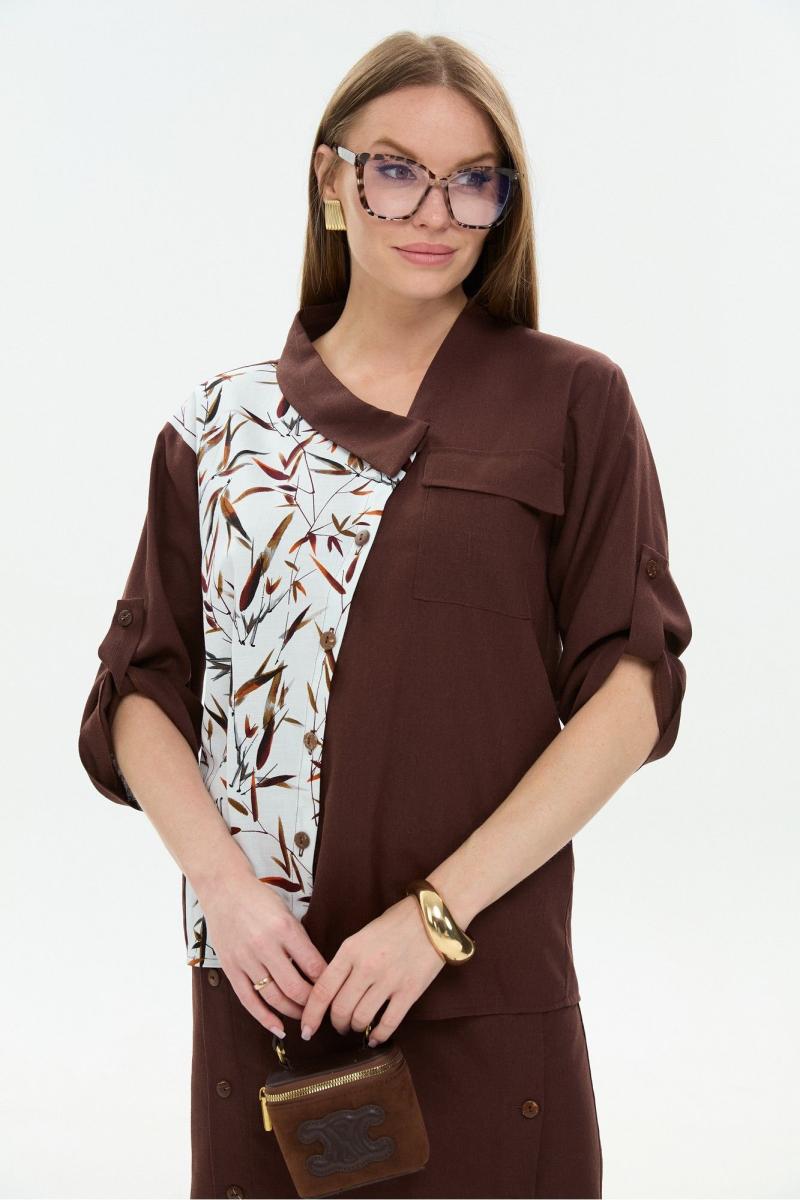 Жакет рубашечного типа прямого силуэта с асимметричным низом. Рукав втачной со спущенной линией плеча, фиксируется на пату. Застежка центральная на петли и пуговицы, смещённая по косой. Воротник отложной на стойке до половины спинки.