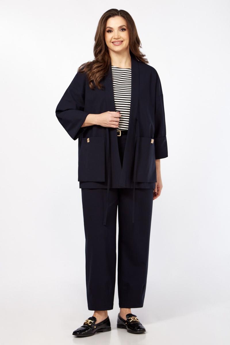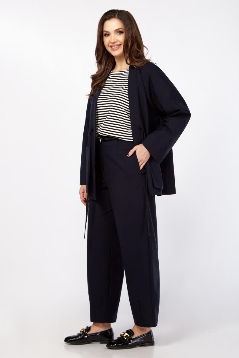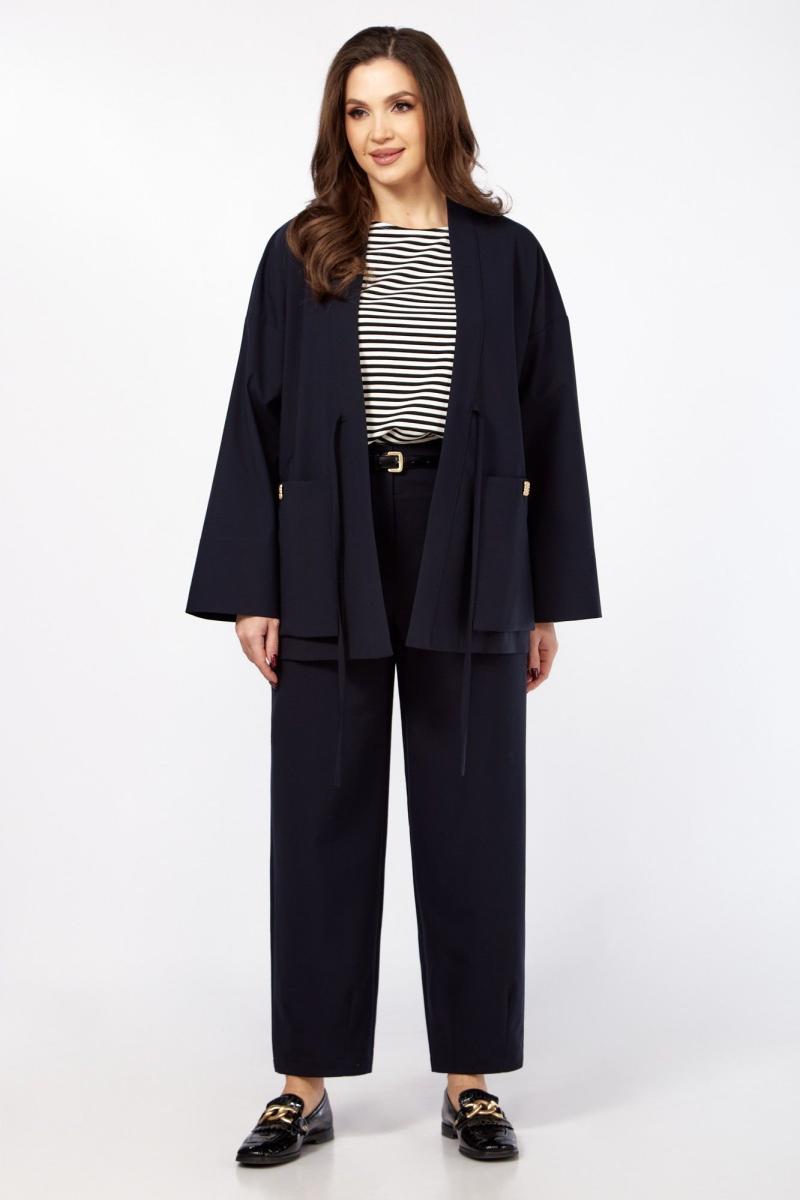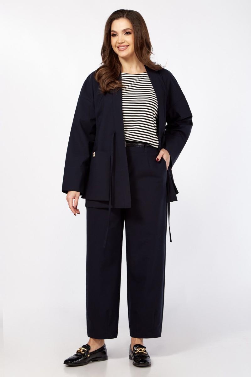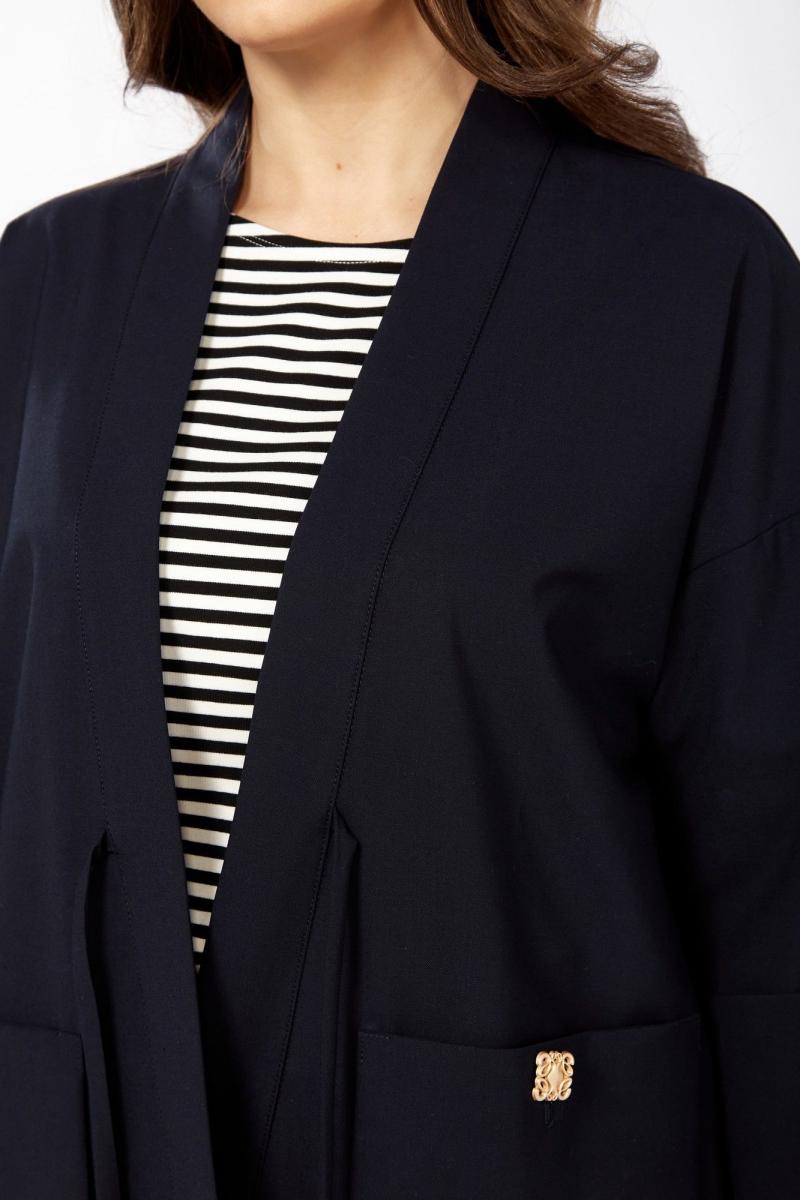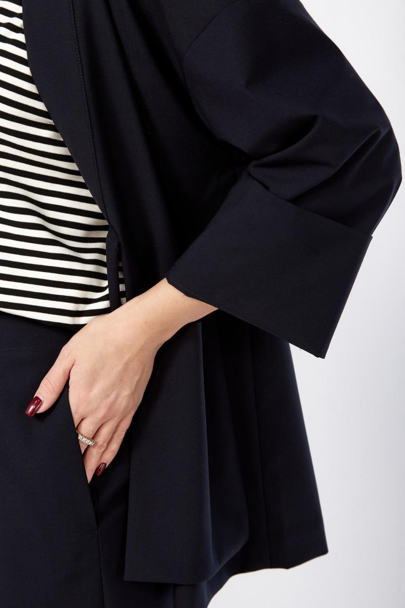 Жакет женский удлиненный в стиле кимоно из костюмной ткани с притачной планкой по борту и горловине. В качестве застежки служат втачные завязки по планке. Спереди обработаны большые накладные-отлетные карманы, фиксируемые на петлю и пуговицу. Линия плеча спущена, рукава длинные широкие по низу с высокой подгибкой.