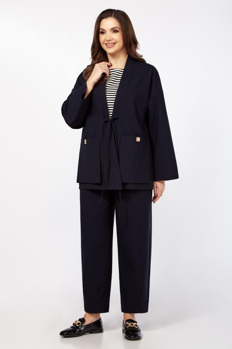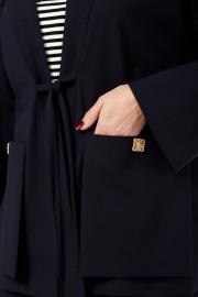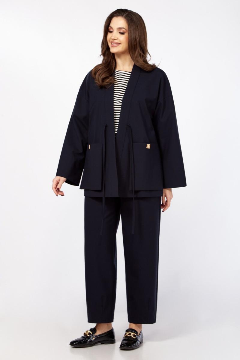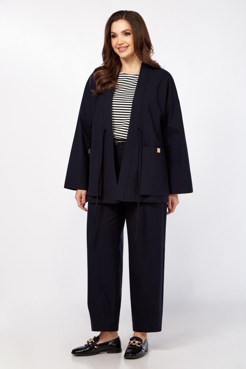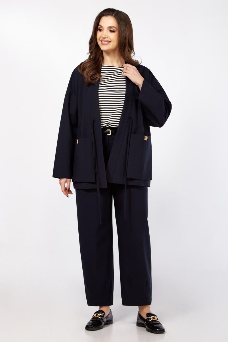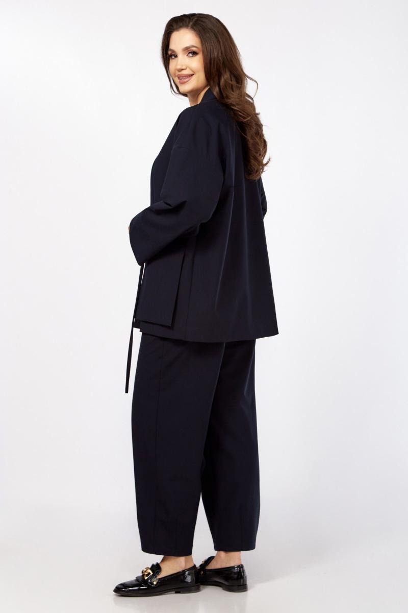 Жакет женский удлиненный в стиле кимоно из костюмной ткани с притачной планкой по борту и горловине. В качестве застежки служат втачные завязки по планке. Спереди обработаны большые накладные-отлетные карманы, фиксируемые на петлю и пуговицу. Линия плеча спущена, рукава длинные широкие по низу с высокой подгибкой.