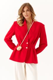 Жакет женский из поливискозной ткани красного цвета. Стильный жакет полуприлегающего силуэта, выполненный из качественной поливискозной ткани, идеально подходит для повседневной носки. Модель застегивается по центру на обметанные петли и пуговицы, что обеспечивает удобство и классический вид. Перед жакета украшен защипами по талии и плечевой вытачкой, а боковые детали (бочок) создают аккуратный силуэт. Спинка с средним швом дополнена защипами по талии для дополнительной посадки. V-образная горловина обработана подбортом — эта деталь подчёркивает элегантность модели. Длинные втачные рукава делают жакет универсальным вариантом для разных сезонов. Жакет выполнен на поливискозной подкладке для комфортного ношения.