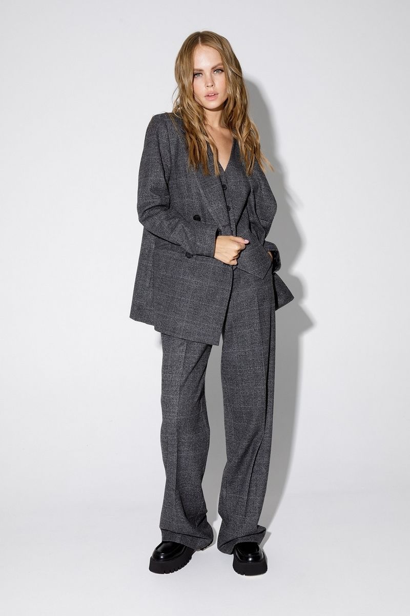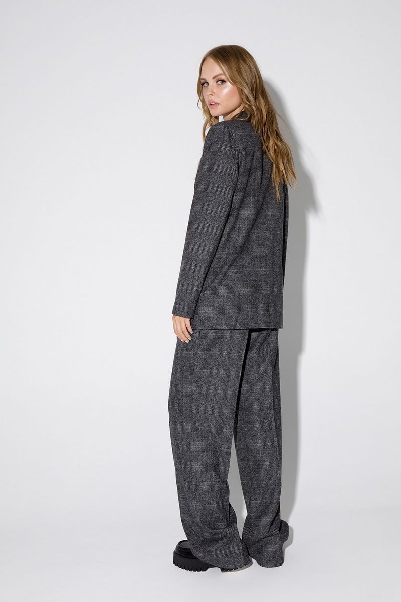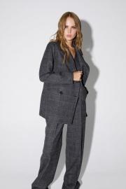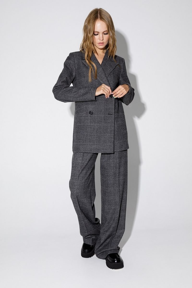 Двубортный жакет свободного покроя из текстильной ткани в клетку. Детали: жакет прямого силуэта, пиджачный воротник, прорезные карманы, спинка со средним швом, втачные двухшовные рукава, жакет на подкладке Длина по спинке около 70/72 см, длина рукава около 61 см