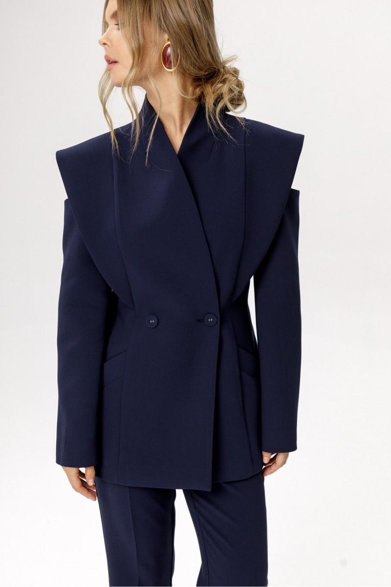 Приталенный двубортный жакет. Детали: полуприлегающий силуэт, цельнокроеный воротник-стойка, двубортная застёжка на петли и пуговицы, рельефные швы переда и спинки с декоративным элементом, рукава длинные с вырезами по верху, функциональные карманы, жакет на подкладке. Длина изделия по спинке в размерах 40-46 около 71 см, в размерах 48-52 около 74 см, длина рукава около 61 см. Приобрести брюки с фото можно по арт. 6343