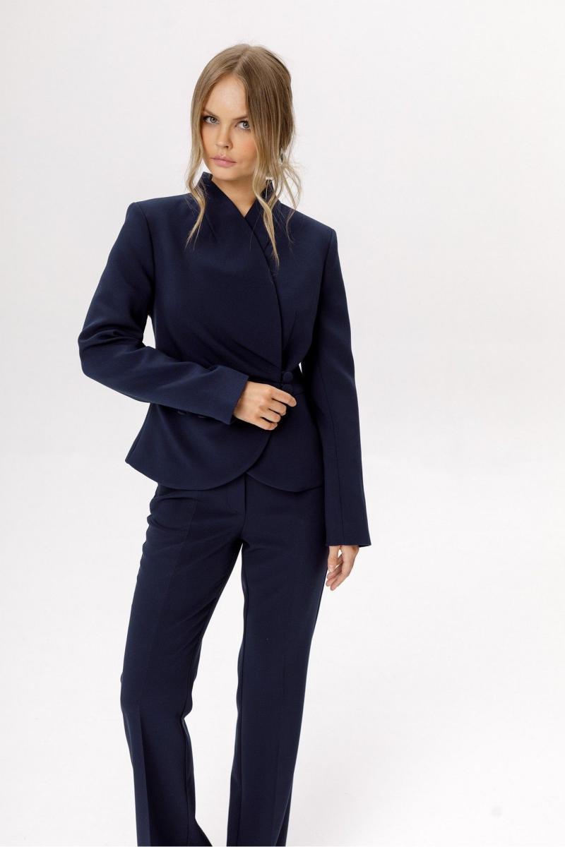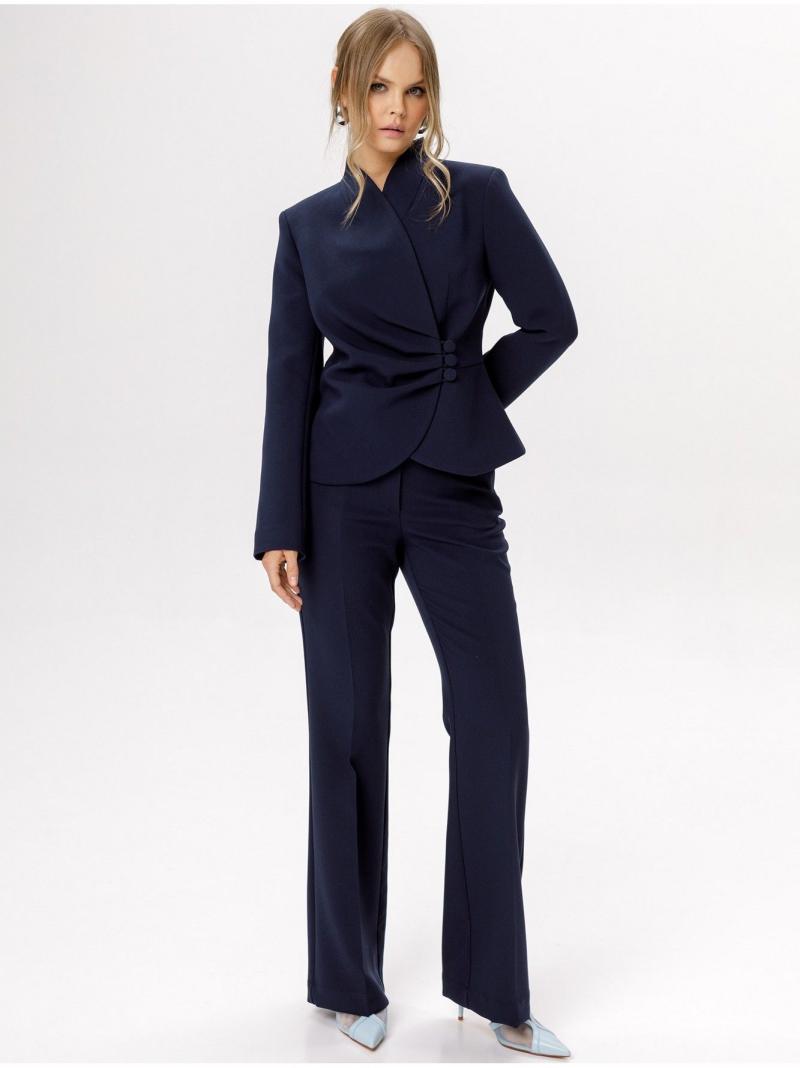 Приталенный укороченный жакет со складками на талии (приобрести брюки с фото можно по арт. 6343, приобрести юбку с фото можно по арт. 6673). Детали: полуприлегающий силуэт, перед со складками, спинка со средним швом и талиевыми вытачками, воротник с цельнокроенной стойкой, застежка на три навесные петли и пуговицы, рукава втачные двухшовные с имитацией шлицы и тремя декоративными пуговицами, на подкладке. Длина по спинке около 57 см в размерах 40-46, около 59 см в размерах 48-52, длина рукава около 62 см.