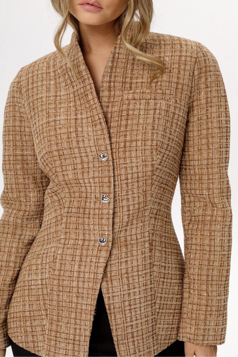 Приталенный твидовый жакет с акцентными плечами и съемным шарфиком (приобрести брюки с фото можно по арт. 6557, приобрести юбку с фото можно по арт. 6612). Детали: полуприлегающий силуэт, цельнокроеная стойка, застежка на петли и пуговицы, имитация нагрудного кармана, рукава фигурные длинные с верхним швом и объемными плечевыми накладками. Длина жакета по спинке со стойкой около 67 см в размерах 40-46 и около 69,5 см в размерах 48-52. Длина рукава около 63 см.