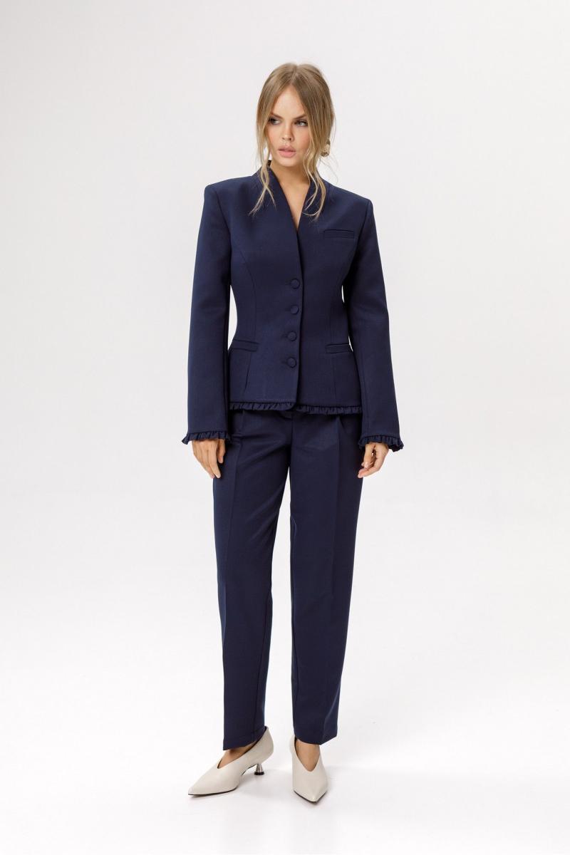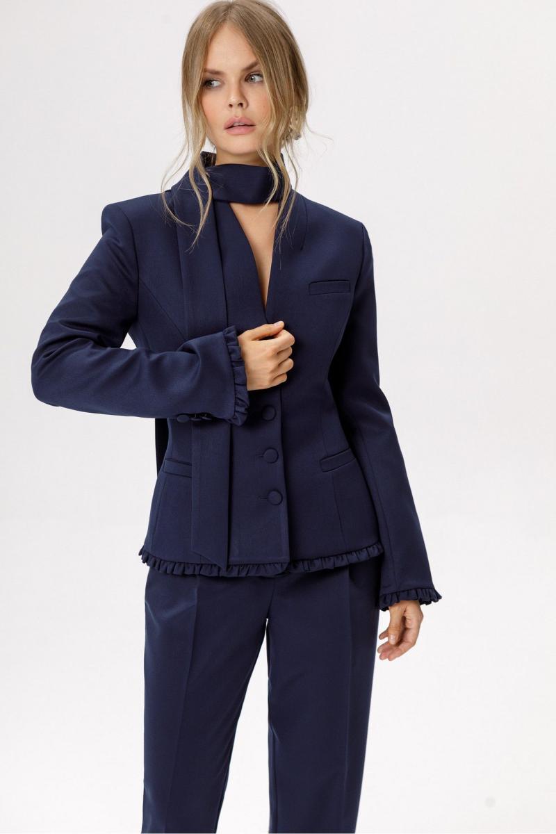 Приталенный жакет с оборками и съемным шарфиком (приобрести брюки с фото можно по арт. 6292 или 6343). Детали: жакет полуприлегающего силуэта, цельнокроеный воротник-стойка, рельефные швы переда и спинки, функциональные карманы, застежка на петли и пуговицы, на подкладке. В комплекте съемный шарфик. Длина по спинке около 56 см в размерах 40-46 и около 58,5 см в размерах 48-52, длина рукава с оборкой около 61 см.