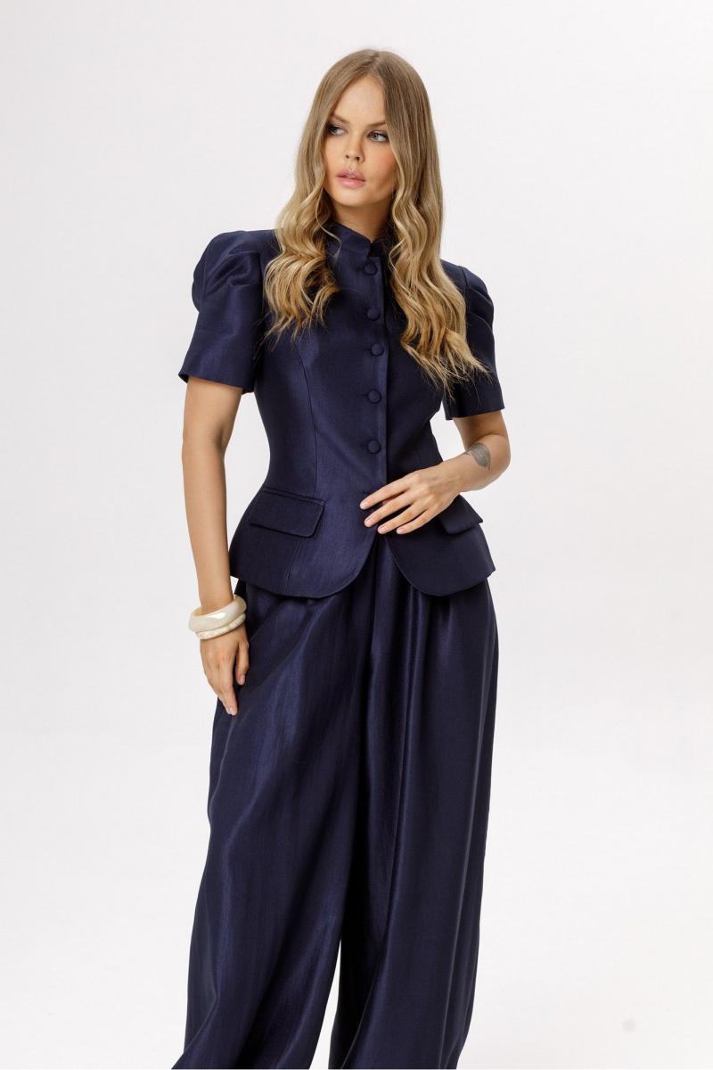 Укороченный жакет с рукавами-фонариками (приобрести брюки с фото можно по арт. 6671 или блузу 6618, кейп 6640). Детали: прилегающий силуэт, рельефные швы, воротник-стойка, застежка на петли и пуговицы, рукава короткие со складками по окату, на подкладке. Длина по спинке около 55,5 см в размерах 40-46, около 58 см в 48-52