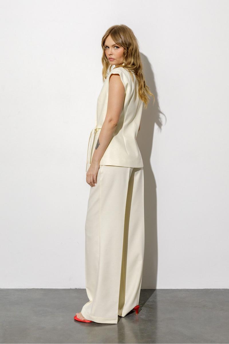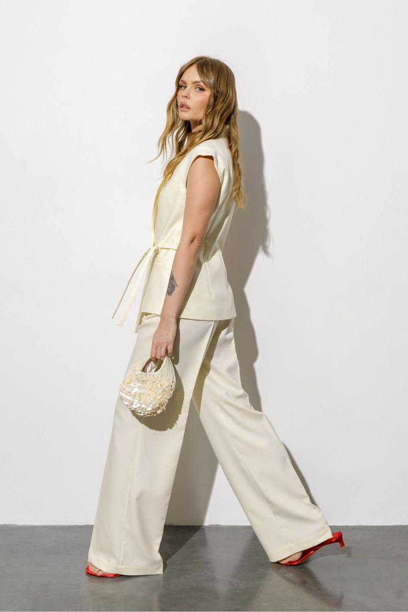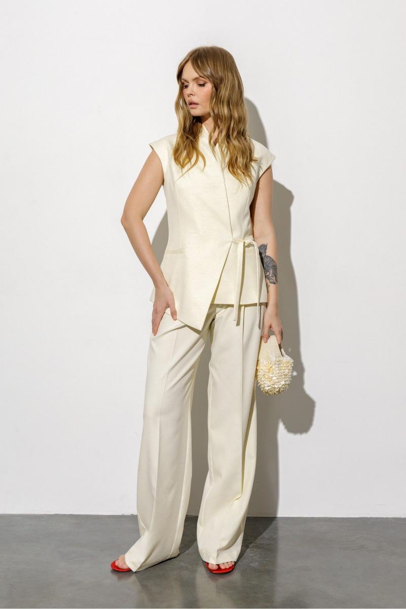 Приталенный асимметричный жилет из текстильной ткани (приобрести брюки с фото можно по арт. 6689). Детали: жилет прилегающего силуэта, талиевые вытачки по переду и спинке, фигурный борт со смещённой застёжкой на завязку, спинка со средним швом, функциональные карманы с листочками, воротник с цельнокроенной стойкой, жилет на подкладке. Длина по спинке около 61 см в размерах 40-46 и около 64 см в размерах 48-52.