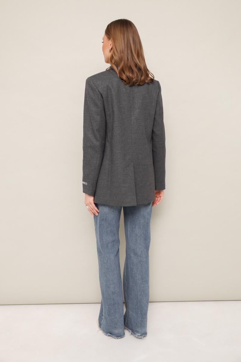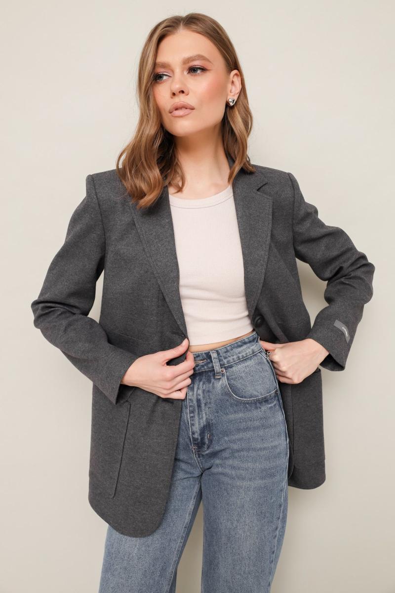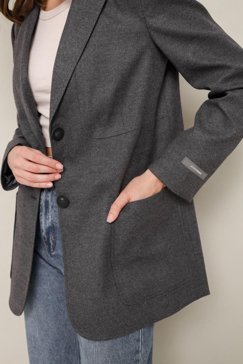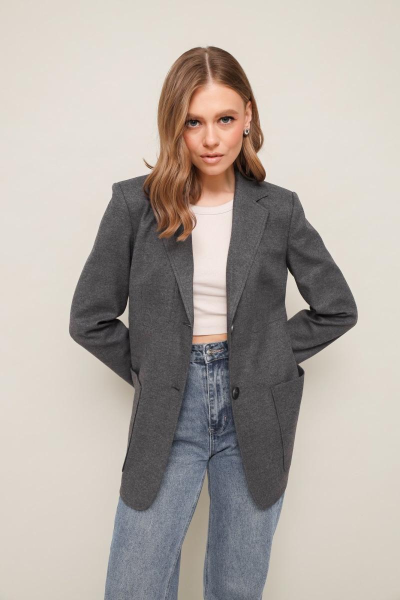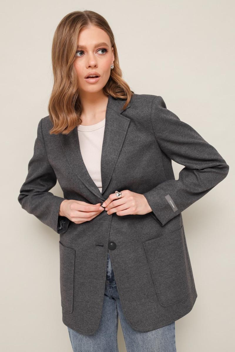 Стильный жакет полуприлегающего силуэта, выполнен из костюмной ткани. Воротник пиджачного типа с отложными лацканами. Застежка центральная на петли и пуговицы. Спереди обработаны накладные карманы, в области груди подрезы с нагрудными вытачками. Спинка с рельефами и средним швом, переходящим в шлицу. Рукава втачные двухшовные, на левом рукаве декоративная нашивка. Изделие на подкладке.