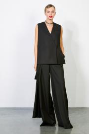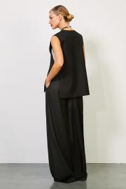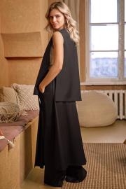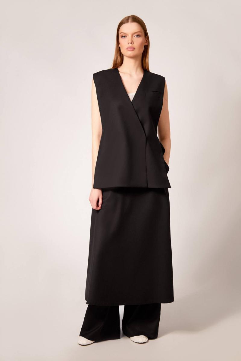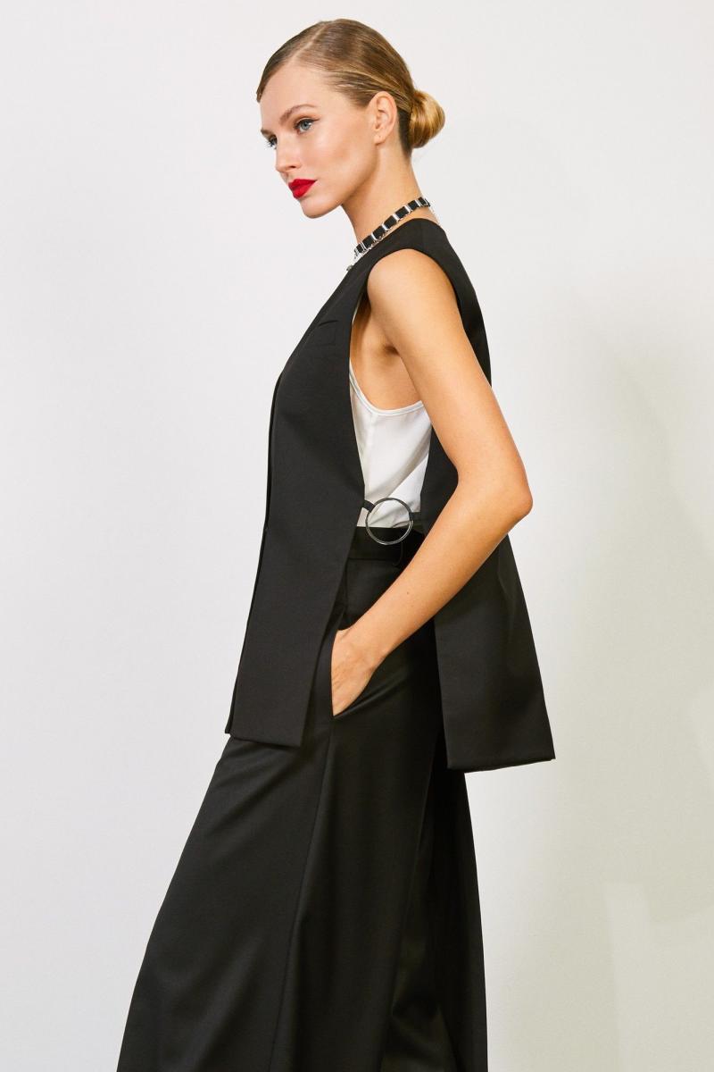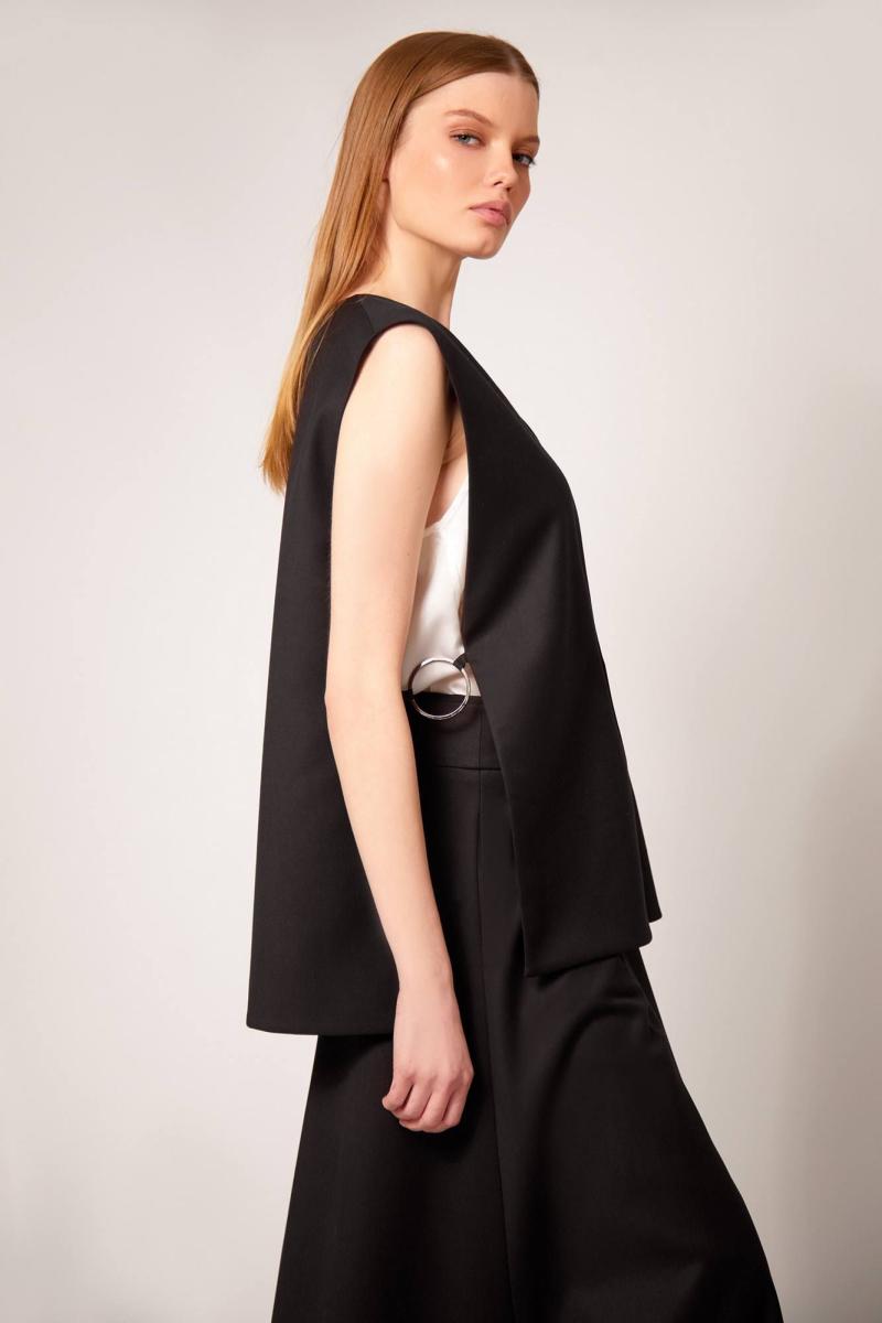Жилет: - прямой силуэт - двухслойный - со смещённой застёжкой на потайные кнопки - по бокам детали переда и спинки скреплены кольцами