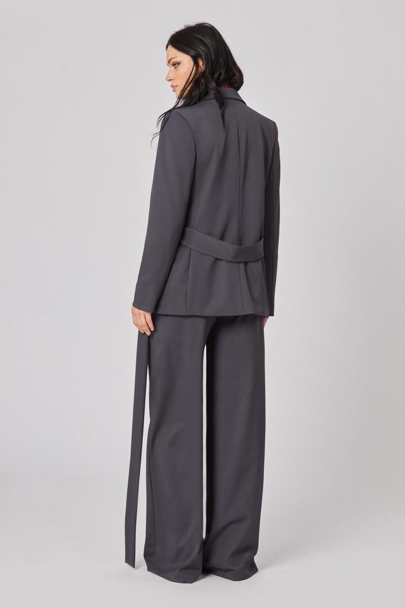Жакет: - полуприталенный силуэт - пиджачный воротник - рельефы по переду и спинке -боковые карманы - застежка на потайные кнопки - декоративный пояс с пряжкой - длина жакета до середины бедер, прямой низ.
