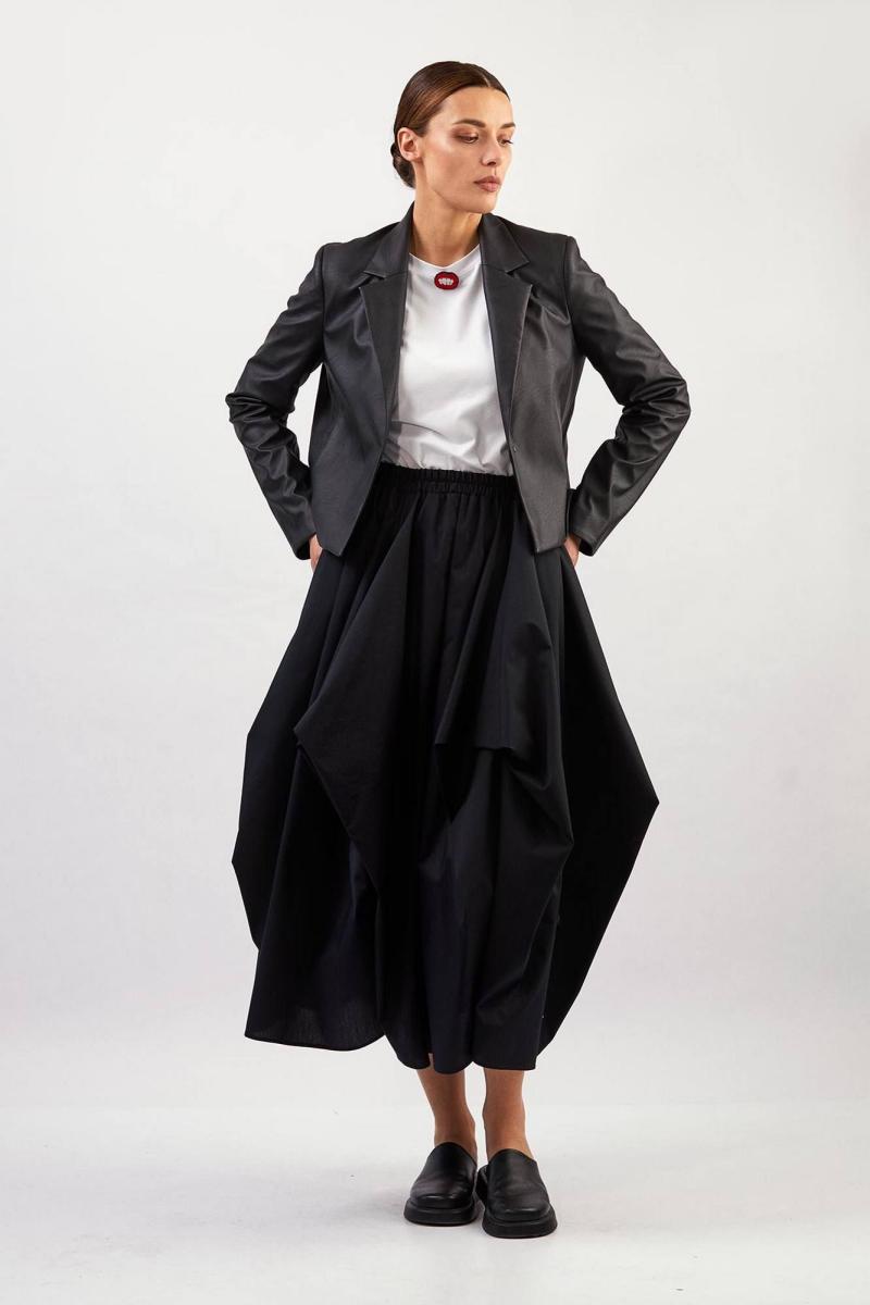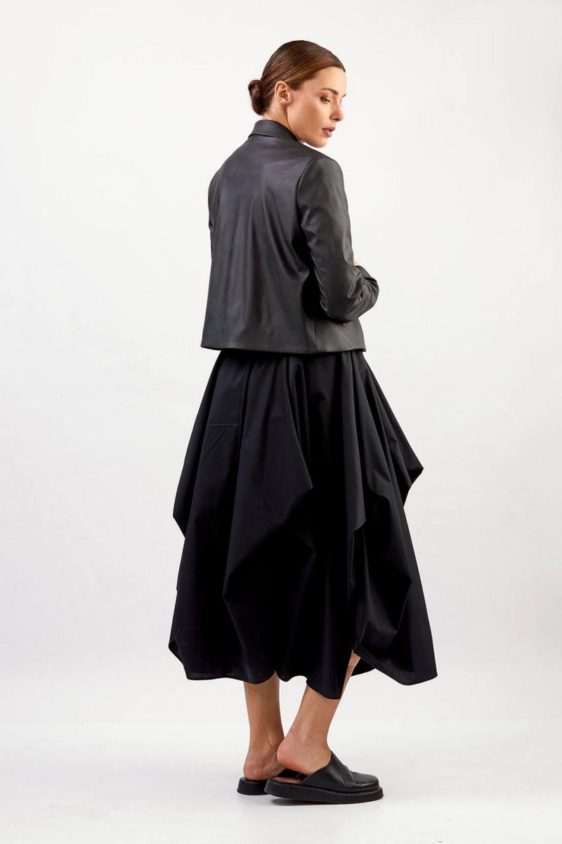 Жакет из эко-кожи - прямой силуэт - спереди рельефы с карманами в швах - спинка цельная, без швов - рукава втачные, двухшовные - воротник пиджачного типа - застёжка на кнопку - на подкладке