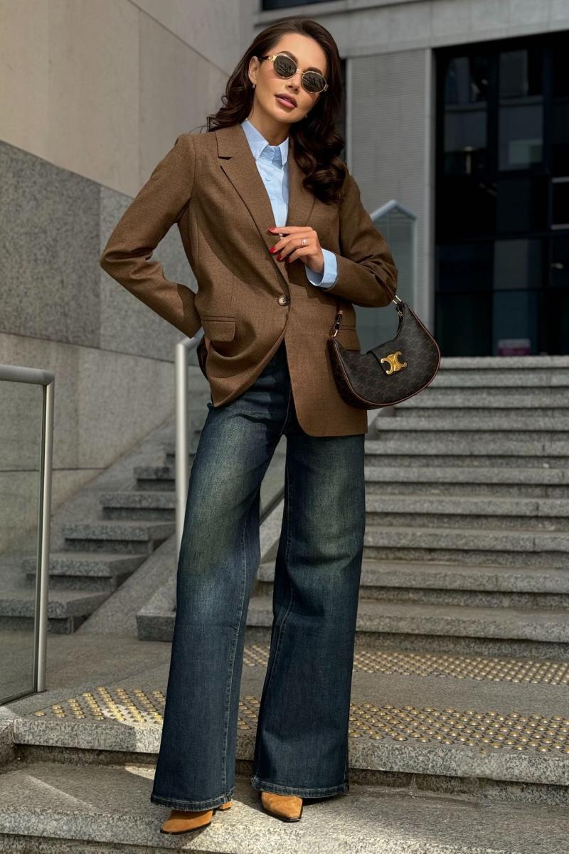 Жакет из шерстяной ткани представляет собой идеальный баланс элегантности и комфорта. Его классический крой сочетается с продуманными деталями, подчеркивающими строгий, но расслабленный образ. Нежная шерсть придаёт изделию мягкость и приятную текстуру, что делает его особенно уютным в прохладные дни. Цвет жакета, выполненный в спокойных коричневых оттенках, подчёркивает его универсальность, что позволяет легко комбинировать его как с джинсами, так и с классическими брюками. Это безупречный выбор для тех, кто ценит изысканность и практичность в повседневных нарядах. Жакет женский, полуприлегающего силуэта, выполнен из костюмной полушерстяной ткани с рисунком ""гусиная-лапка"" на притачной подкладке, с центральной бортовой застежкой на 2 петли и 2 пуговицы (размер и цвет фурнитуры может незначительно отличаться от фото). Жакет может быть как для нарядной, так и для повседневной носки.