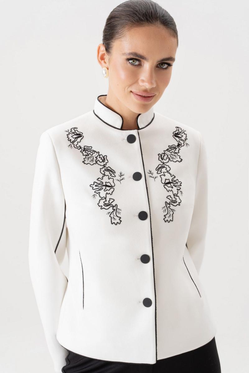 Жакет с центральной бортовой застежкой на 5 петель и пуговиц (фурнитура может незначительно отличаться от фото). По верху жакета выполнена вышивка. Перед с нагрудными вытачками, выходящими из бокового шва и вертикальными карманами с листочкой с отделкой кантом.