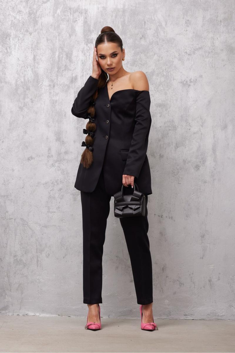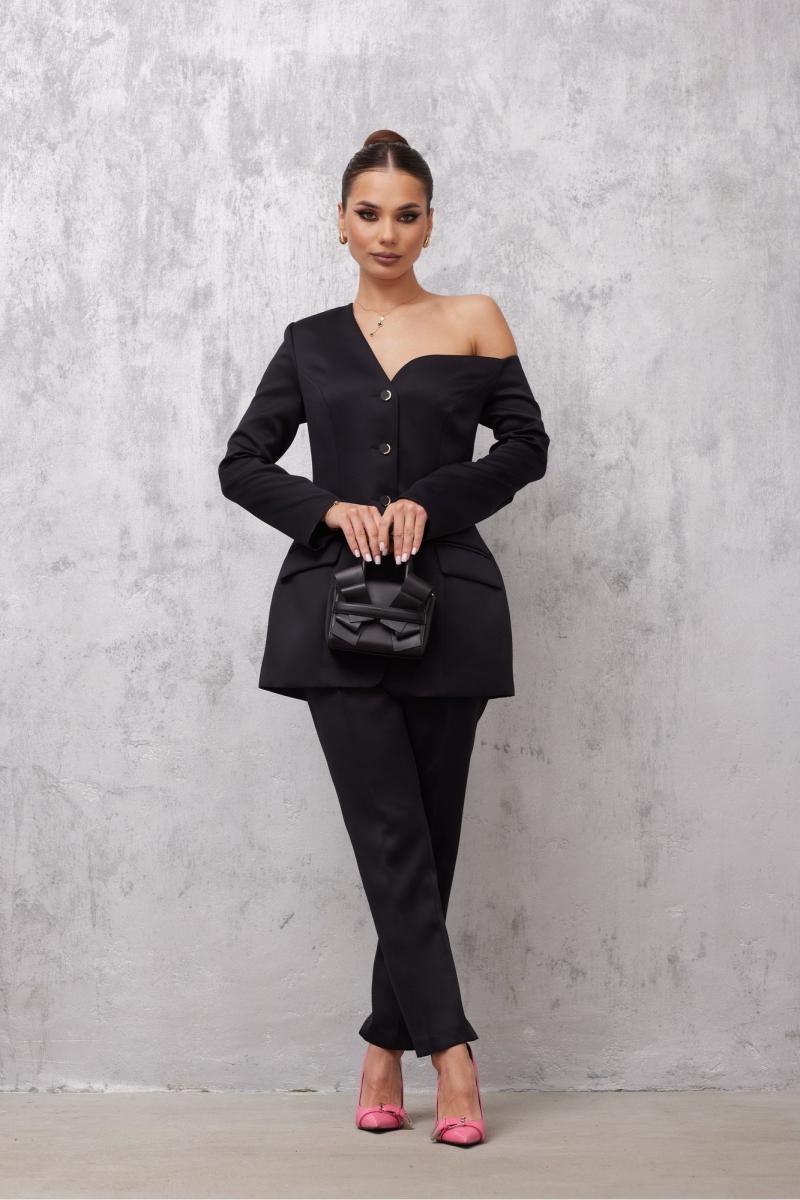 Жакет прилегающего силуэта с одним открытым плечом. Застежка по переду на петли и пуговицы. На переде карманы с клапаном. Рукав прямой. Жакет на подкладке.